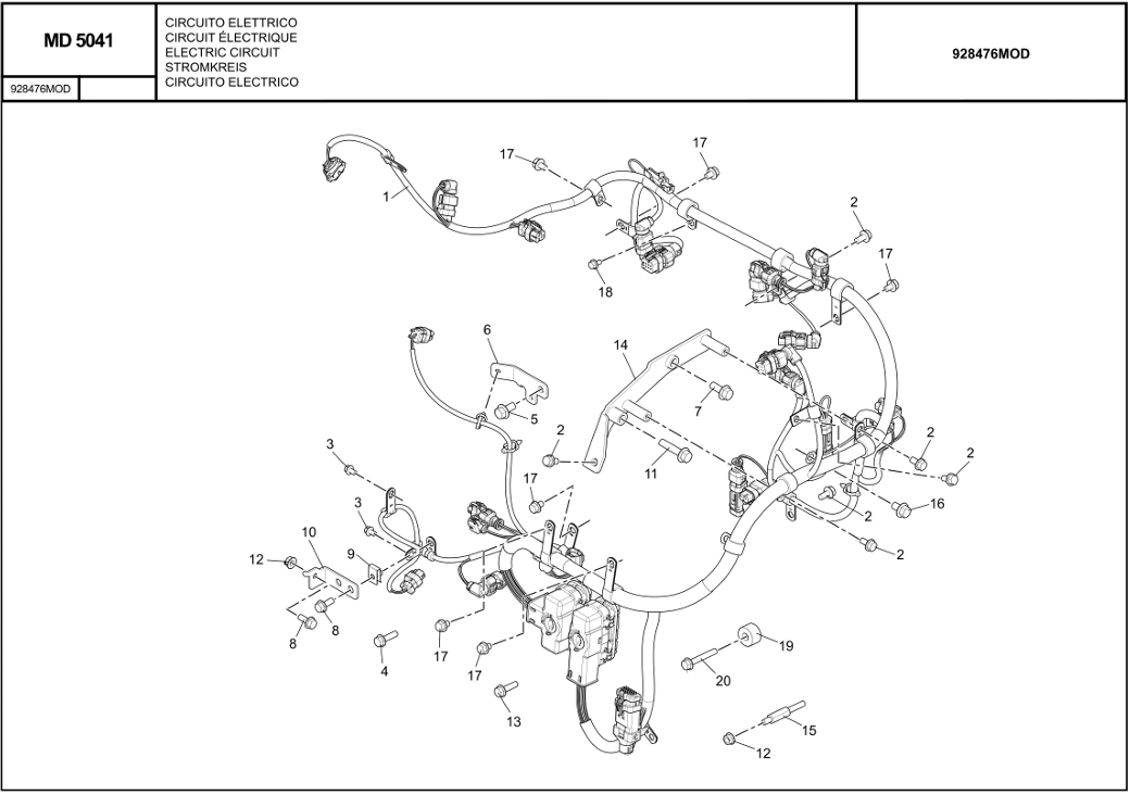 Item Part No. Name Remarks / Characteristi cs Qty Machine applicability 1 797288 wiring 1 2 796016 Screw M8 6 3 795995 Screw M6, H M6-12 2 4 795957 Screw H M8-30, M8 1 5 796433 Screw H M10-20, M10 1 6 796434 support 1 7 796044 Screw M10 1 8 795926 Screw M8, H M8-25 2 9 796436 Nut 1 10 796437 Support 1 11 797298 Screw 1 12 795952 Nut M8 2 13 796439 Screw M8, H M8-35 1 14 797237 support 1 15 797222 Stud 1 16 796036 Screw H M10-16, M10 1 17 796442 Screw 6 18 796153 Screw 1 19 795969 Spacer 1 20 796444 Covering 1